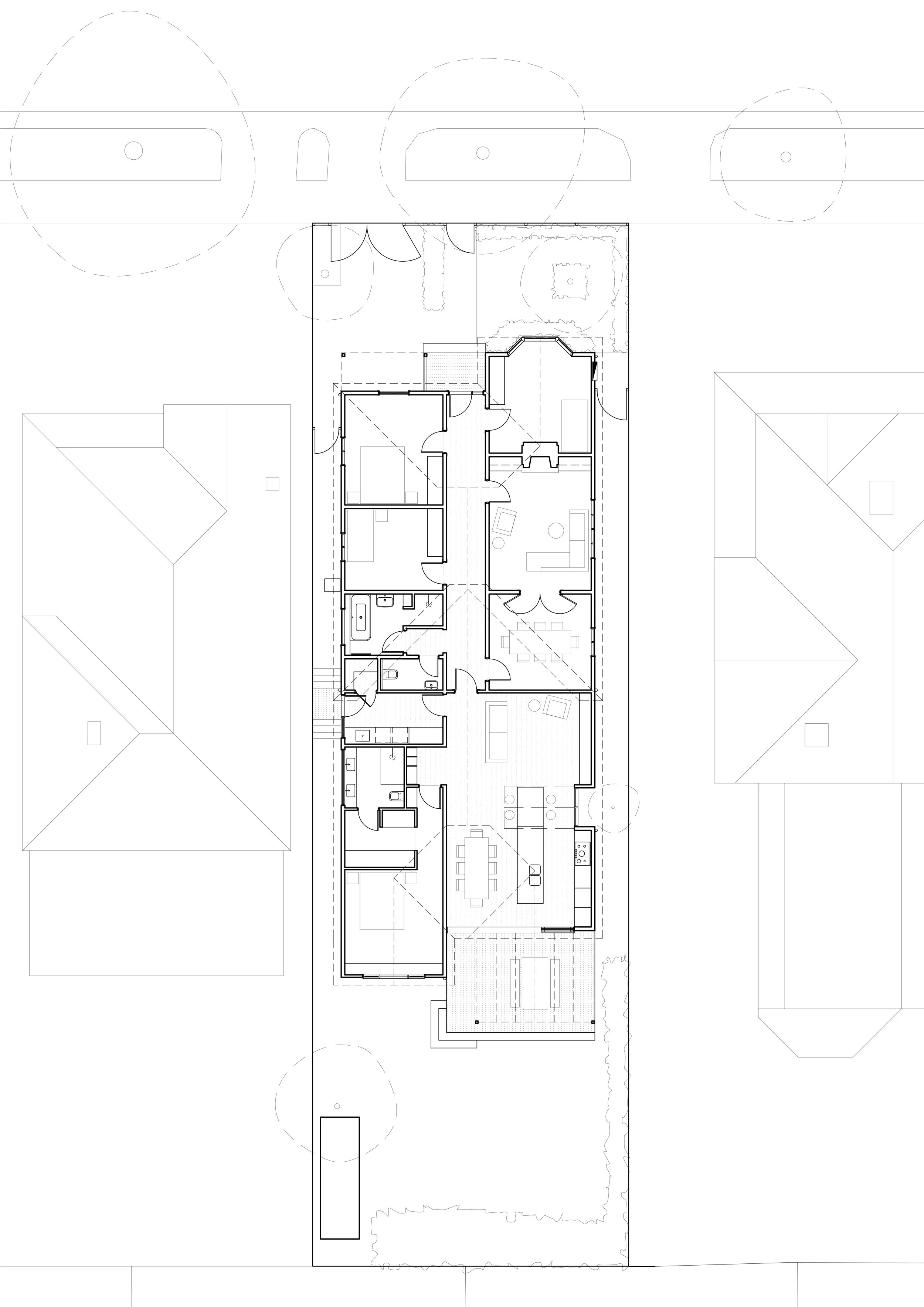 An existing Edwardian weatherboard house has been beautifully maintained but a previous rear addition to the original house is in need of modification to meet the needs of this young family. The main bedroom was extended slightly to provide a robe and ensuite and reworked to enhance privacy. The kitchen area was relocated to connect to a new outside deck, extending the living space. A new window and skylight is carved into the east side of the house to bring light into the kitchen.