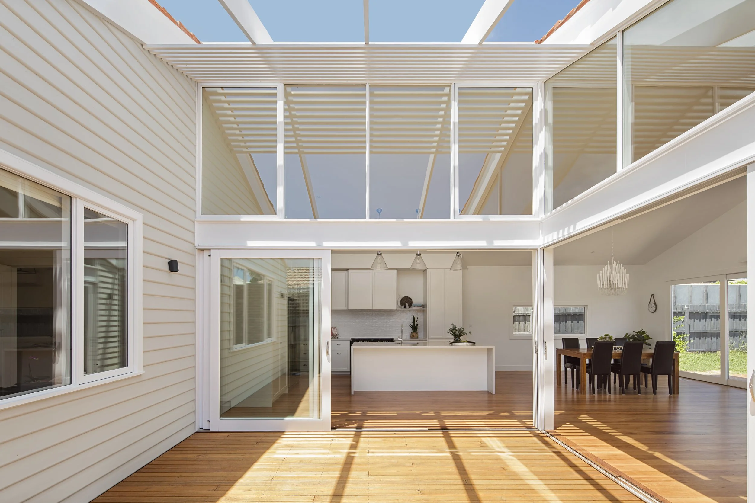 The challenge here was the backyard faced south. A key driver for the project was how to bring north light into new living spaces while opening them to the backyard. The roof form of the existing Californian bungalow was extended through the site and then a small courtyard carved away. The internal courtyard became the clever solution — capturing northern light and drawing it deep into the new living spaces. Living areas are now bathed in winter light, while timber battens exclude summer sun. The courtyard becomes an extension of the living space, allowing family life to spill outside when extra space is required.